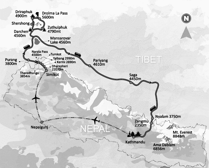 Then we will make the 'kora' (holy-walk) of the mountain sharing the trail with other pilgrims towards Mt. Kailash. After completing this trek we will drive back to Sher and trek back via Limi valley of Karnali. You wiill enjoy the stunning views of the Limi valley as we trek towards Simkot to take our return flight to Kathmandu. This adventure is perfect for those travelers who want to avoid long and hard driving in Tibet.